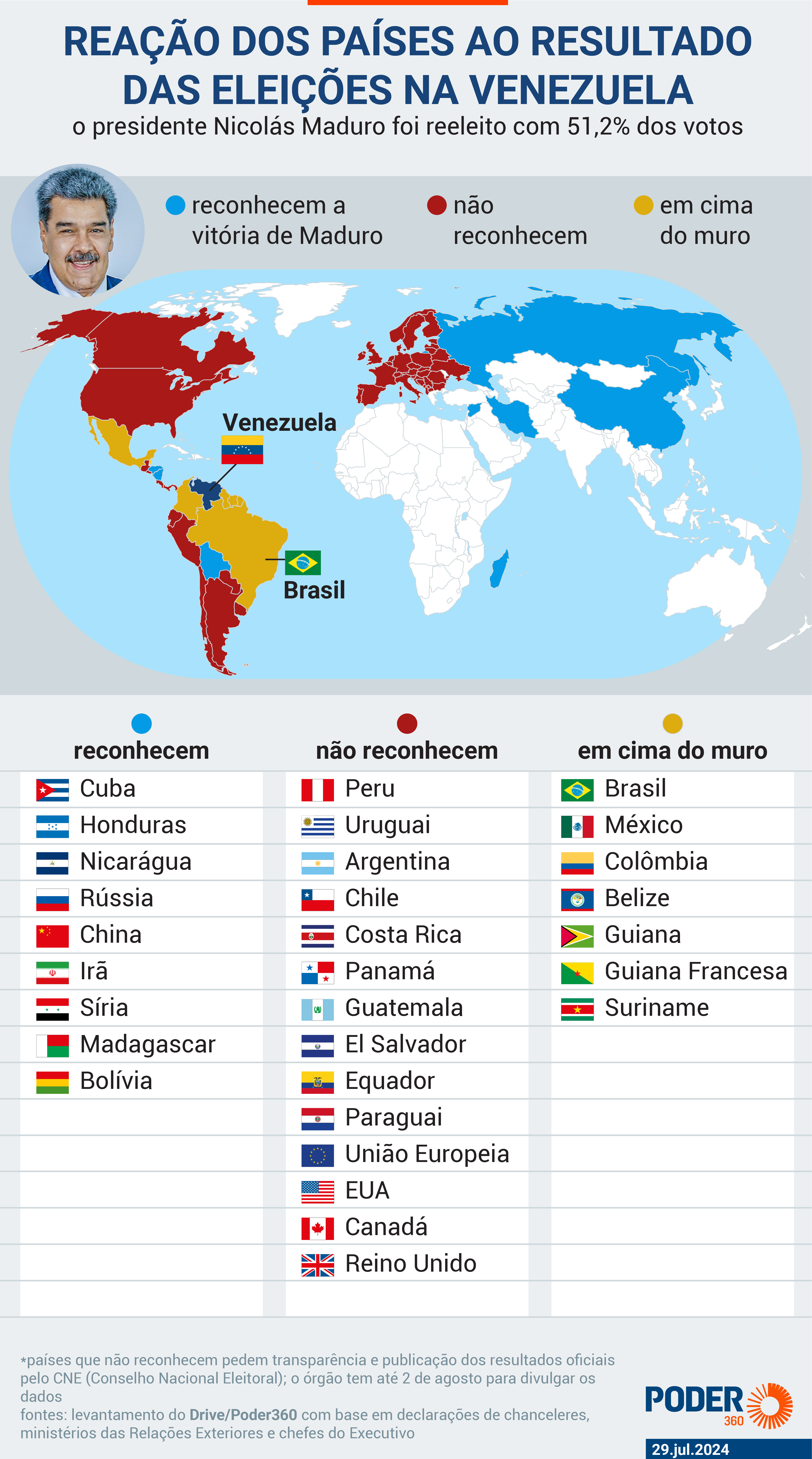 Lula, forçoso nome da legenda, ainda nunca se manifestou. O administração brasílio segue em cume do murado. Anunciou que isolado irá se proferir em seguida que o CNE (Juízo Pátrio Eleitoral), órgão venezuelano controlado velo estatuto chavista, vulgarizar os dados integrais das eleições, o que pode ser acabado até 6ª feira (2.ago).