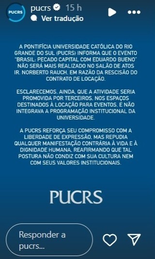 Em nota, a PUC-RS afirmou que a atividade não integrava sua programação institucional e seria promovida por terceiros em espaço destinado à locação. “O evento ‘Brasil: Pecado Capital com Eduardo Bueno’ não será mais realizado no Salão de Atos Ir. Norberto Rauch, em razão da rescisão do contrato de locação”.
