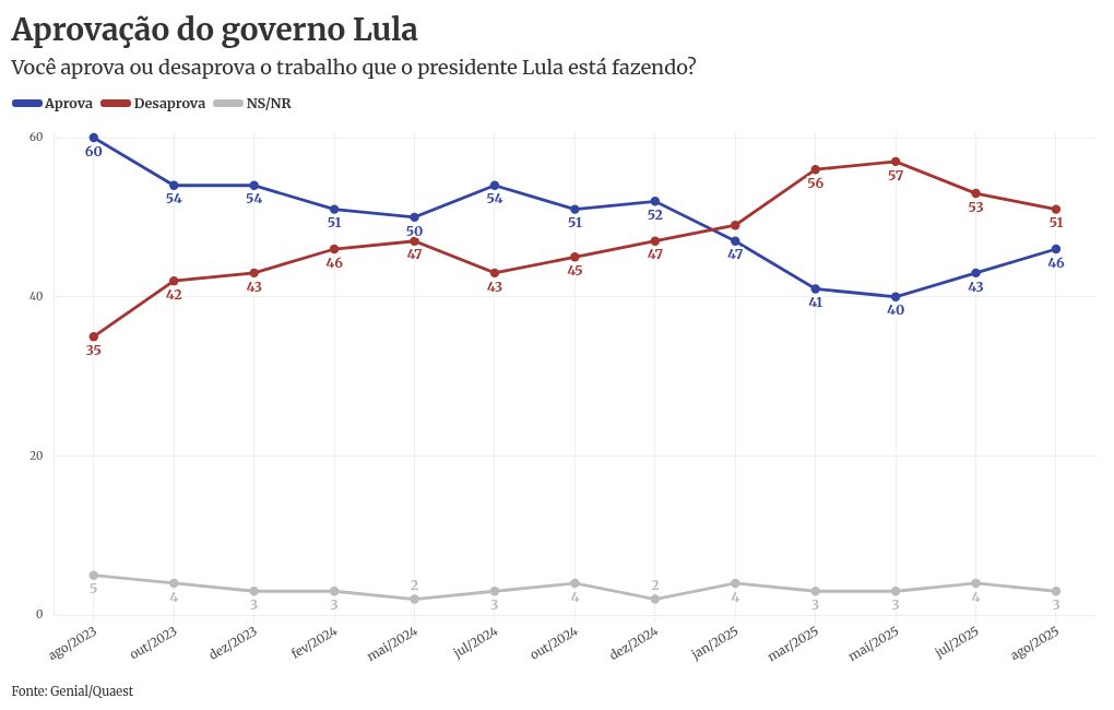 O foco da pesquisa é a aprovação do governo Lula. O levantamento mostra que houve um segundo aumento consecutivo na aprovação, que alcançou 46%. O número anterior, referente a julho deste ano era de 43%.