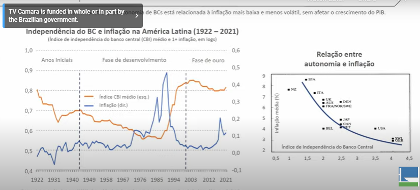 “Temos uma pesquisa feita para a América Latina que mostra claramente que, quanto mais independente é o Banco Central, menor é a inflação”, explicou Campos Neto ao mostrar um gráfico. “A gente consegue ver aqui através dos anos.”