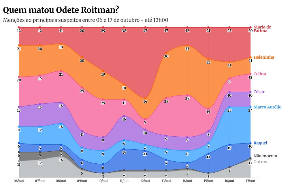 No início do monitoramento, em 6 de outubro, dia em que Odete foi baleada, Heleninha (21%) e Celina (20%) figuravam entre as principais suspeitas, enquanto César, Marco Aurélio e Maria de Fátima tinham 13%, 11% e 12%, respectivamente.