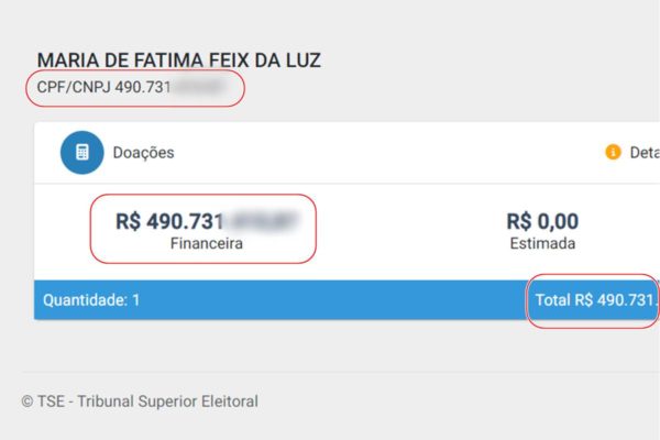 Tudo seria impressionante, não fosse uma falha nítida no registro da doação. Maria de Fátima repetiu o número do próprio CPF no lugar onde ela deveria informar o valor a ser doado. Como é de se imaginar, ao transformar o Cadastro de Pessoa Física em valor monetário, a quantia atingiu um patamar exorbitante: mais de R$ 490,7 milhões.
