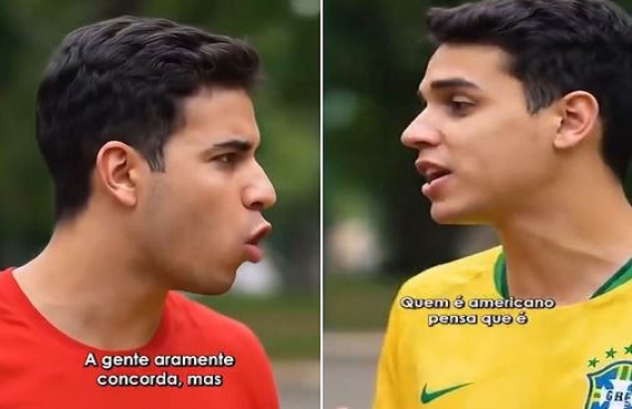 “A gente raramente concorda, mas atacar a soberania do Brasil, assim, do nada, não dá”, diz o personagem de vermelho. O outro, em tom de surpresa, concorda: “Finalmente vou ter que concordar com você. Quem esse americano pensa que é, achando que é o dono do mundo? Aqui é Brasil, não é a Disney.”