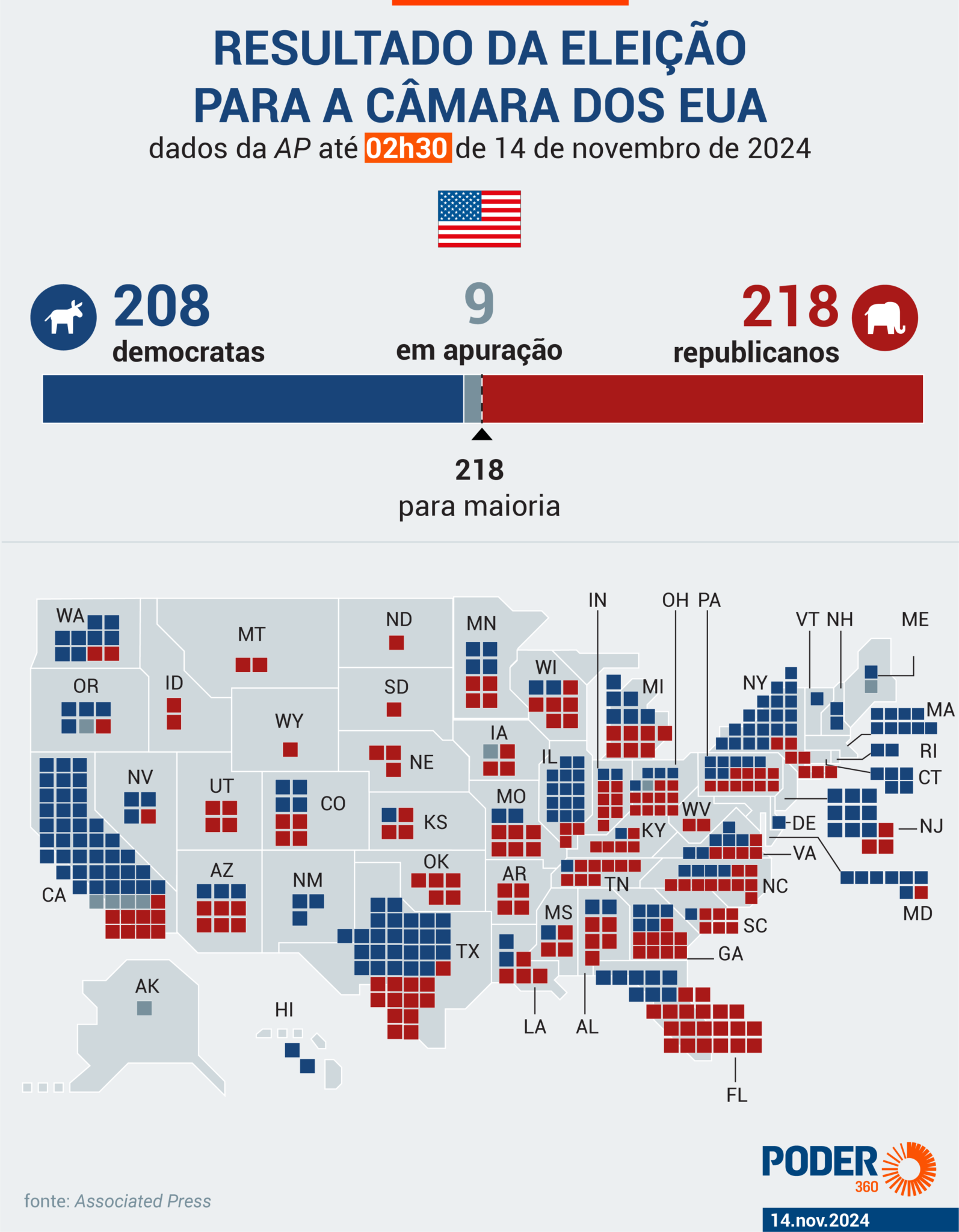 Representantes para liderar o Congresso dos Estados Unidos. A vantagem foi conquistada depois de vitórias nos Estados do Arizona e Califórnia. Com 218 assentos, o partido controlará o órgão durante o governo de Donald Trump (Partido Republicano). Os democratas ficaram com 208 vagas e outras 9 ainda estão na disputa.