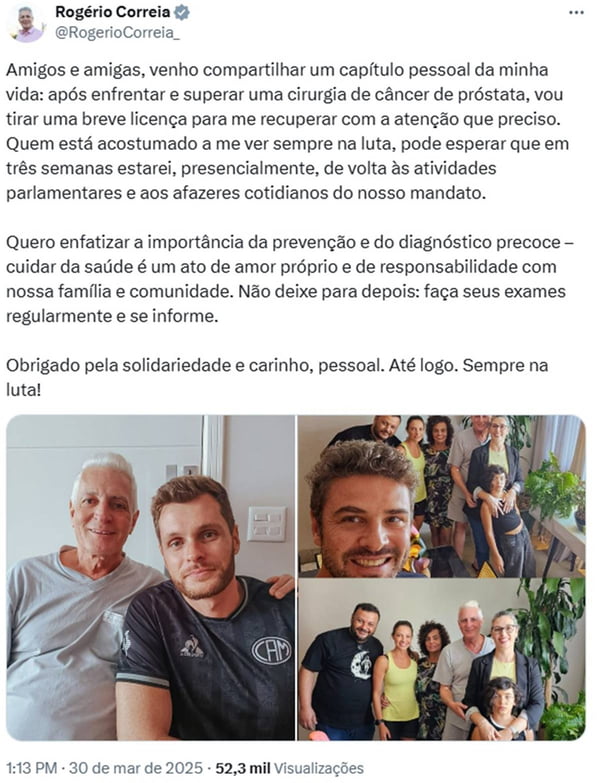O deputado federal Rogério Correia (PT-MG) anunciou que afastará da Câmara dos Deputados, em licença médica, para se recuperar de uma cirurgia feita para tratar um câncer de próstata.