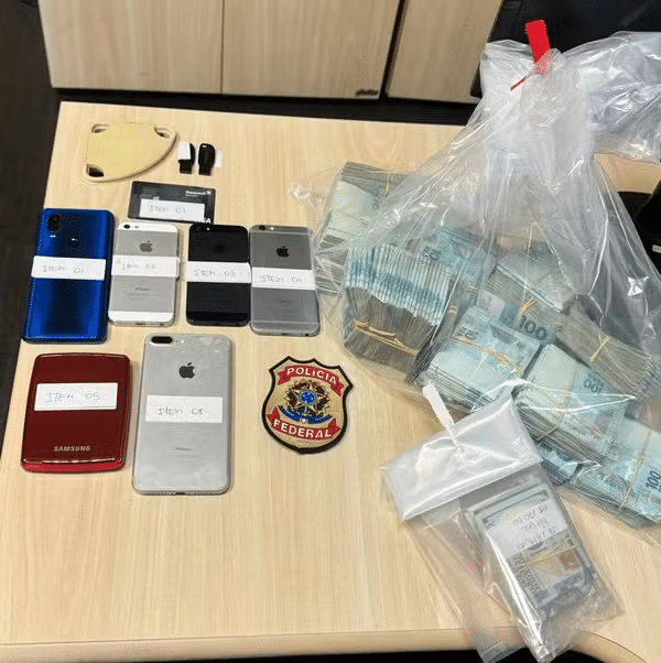 Numerário em estirpe e celulares apreendidos na casa do ex-prefeito de Duque de Caxias Washington Reis (MDB-RJ) — Foto: Polícia Federalista/Traslado