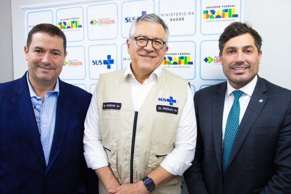 Na imagem que sela o apoio para a construção em São João de Meriti, estão o prefeito da cidade, Léo Vieira (Republicanos), o ministro da Saúde do Brasil, Alexandre Padilha, e o deputado federal Luciano Vieira (Republicanos-RJ), irmão do chefe do executivo no município da Baixada.