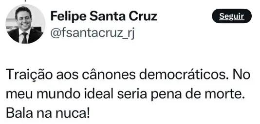 Essa não é a primeira ofensa disseminada por Felipe Santa Cruz. No mês passado, ele defendeu o assassinato de Bolsonaro. Em postagem no X, afirmou que torcia por “bala na nuca” do ex-presidente. Mesmo assim, seguiu — e ainda segue — no primeiro escalão da administração carioca.