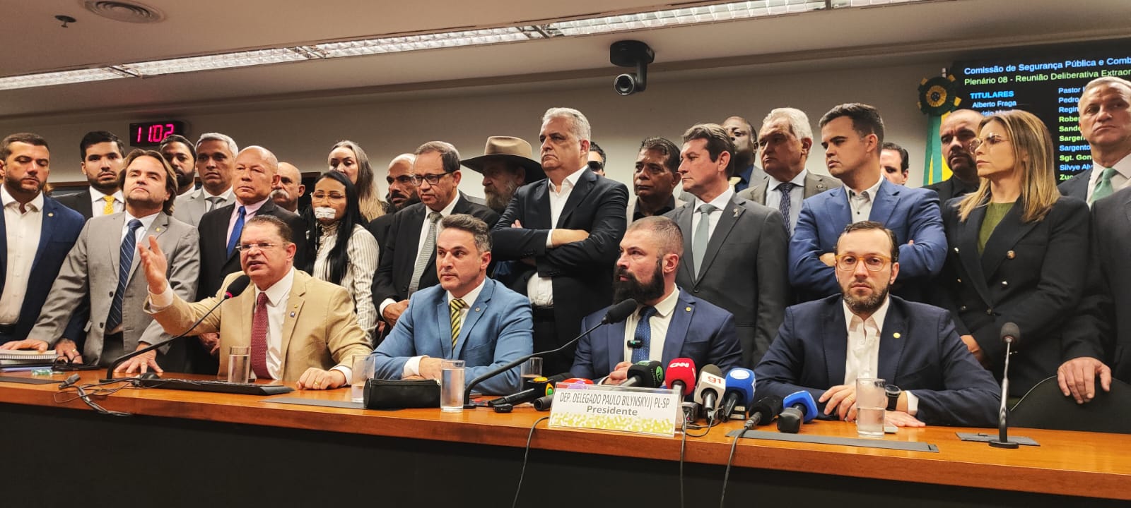 “Hoje é mais um dia histórico na Câmara dos Deputados”, afirmou o líder do PL na Câmara, Sóstenes Cavalcante (RJ), durante coletiva de imprensa com parlamentares da oposição, em Brasília. “Estamos aqui cancelando uma reunião com quórum, convocada pelo presidente da comissão, por uma decisão ilegal, antirregimental, do presidente Hugo Motta.”