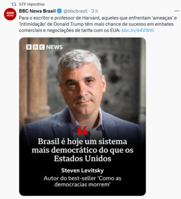 Em meio à crise com os Estados Unidos, cartas e sanções do governo do presidente Donald Trump contra o ministro Alexandre de Moraes, o Supremo Tribunal Federal (STF) repostou em sua rede X uma entrevista do autor do best-seller Como as democracias morrem.