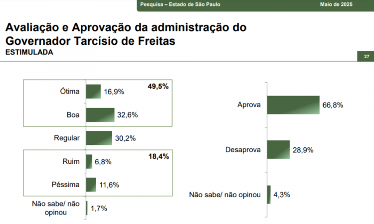 A pesquisa, por outro lado, apresentou uma divisão nas opiniões sobre a gestão do governador. De um lado, 66,8% dos entrevistados aprovaram sua administração, enquanto 28,9% demonstraram desaprovação.