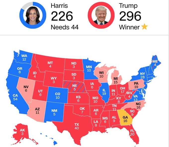 Segundo os dados atualizados, Trump está liderando com 296 votos no colégio eleitoral, enquanto Harris, a candidata democrata, segue com 226.