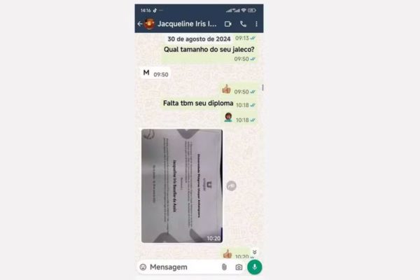 O laboratório afirma que a técnica enviou um registro de tela do diploma da Unopar de biomédica ao ser contratada. Além do certificado, a carteira profissional com habilitação em patologia clínica também foi remetida à clínica.