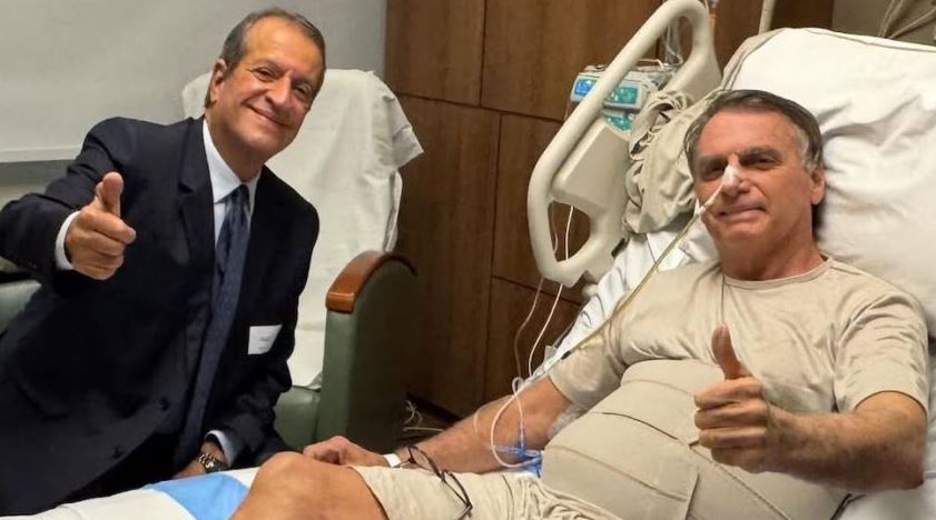 Esta foi a sétima cirurgia pela qual o ex-presidente passou em decorrência das complicações provocadas pela facada que sofreu em 2018. A equipe médica optou por uma laparotomia exploradora, procedimento utilizado para diagnosticar e tratar problemas graves no abdômen. A operação durou 12 horas, o dobro do tempo inicialmente previsto. (Foto: reprodução redes sociais; Fonte: Poder360)