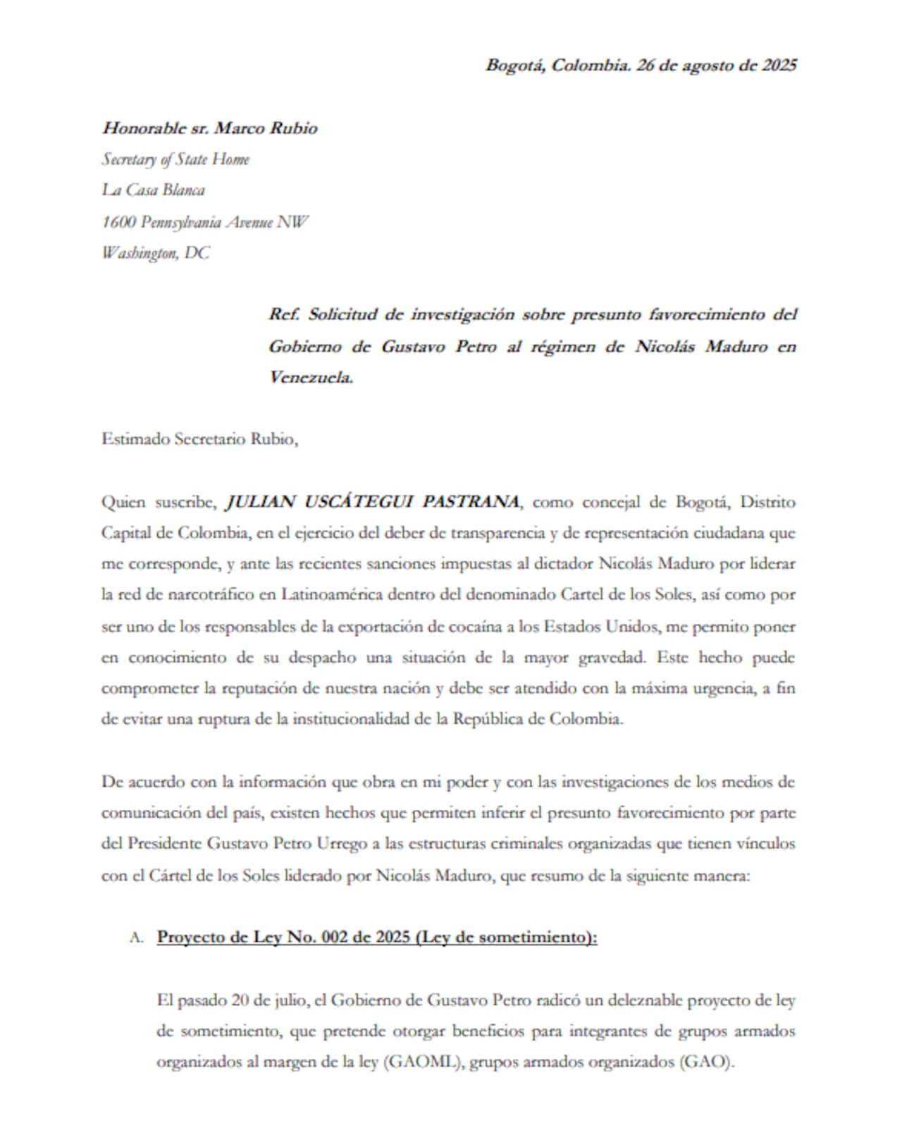 O vereador de Bogotá pelo Centro Democrático, Julián Uscátegui, enviou uma dura carta ao secretário de Estado dos Estados Unidos, Marco Rubio, para que se investigue um suposto favorecimento do governo do presidente Gustavo Petro a estruturas criminosas na Colômbia e ao regime de Nicolás Maduro na Venezuela.