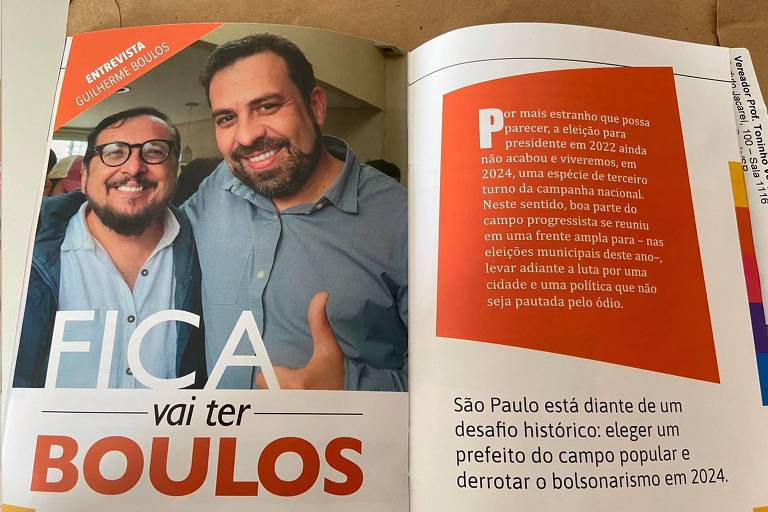 O material igualmente utiliza a vocábulo “fica, vai possuir Boulos”, em uma referência à vocábulo “fica, vai possuir bolo” e, consequentemente, ao apelido do pré-candidato do Psol à Prefeitura de São Paulo.