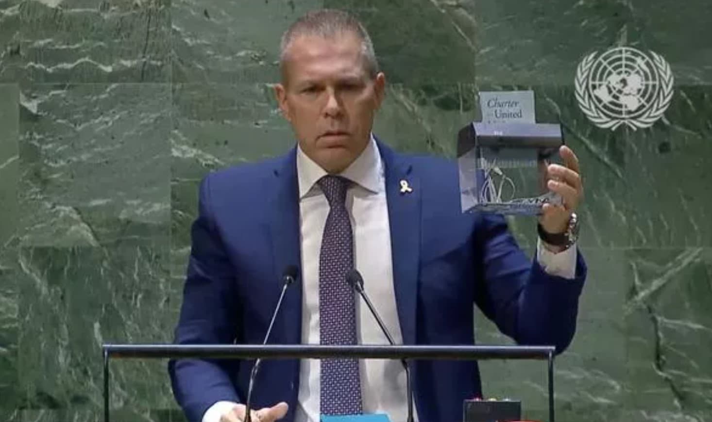 O embaixador de Israel na ONU, Gilad Erdan, protagonizou um momento inusitado durante a Assembleia Geral. Durante a votação de uma resolução que aprovou o reconhecimento da Palestina como Estado soberano, Erdan triturou uma cópia da Carta das Nações Unidas no pódio.