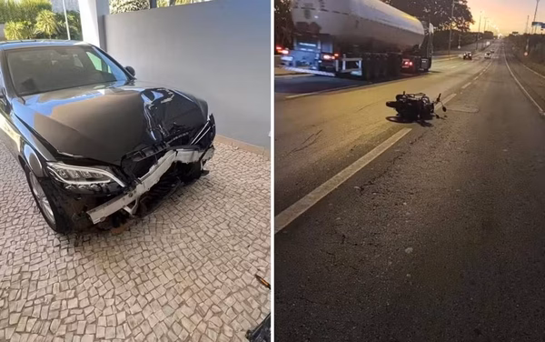 Em razão da batida, a placa do carro se desprendeu e ficou na rodovia, o que ajudou a localizar o motorista, enquanto a placa da moto ficou presa ao para-choque do carro.