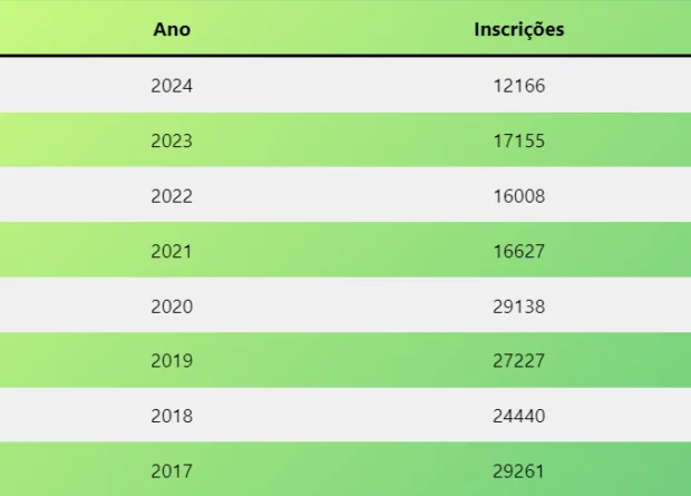 No caso da Epcar (Escola Preparatória de Cadetes do Ar), a situação é mais amena. Em 2017 foram 25.961 inscritos. Em 2018 e 2019 houve aumento dessa quantidade, mas em 2021 foram 22.788 inscritos e em 2022 foram 21.396 inscritos.