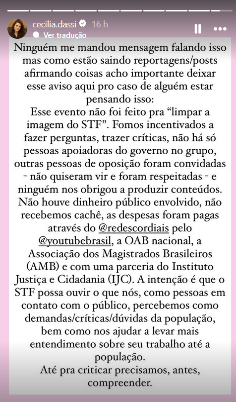A intenção é que o STF possa ouvir o que nós, como pessoas em contato com o público, percebemos como demandas/críticas/dúvidas da população, bem como nos ajudar a levar mais entendimento sobre seu trabalho até a população. Até pra criticar precisamos, antes, compreender – escreveu Dassi nos stories de seu perfil no Instagram.